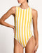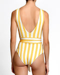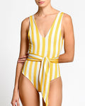 A V-neck one-piece swimsuit with a waist tie, designed to flatter the silhouette while allowing an adjustable and comfortable fit. The wrap-style detail enhances the waist, creating a feminine and balanced shape.