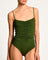 Olive green one-piece swimsuit featuring a flattering center ruching that enhances your silhouette. Designed with thin adjustable straps for comfort and support, this timeless and elegant style is perfect for beach or poolside. Pair it with your favorite summer accessories for a chic, sophisticated look.